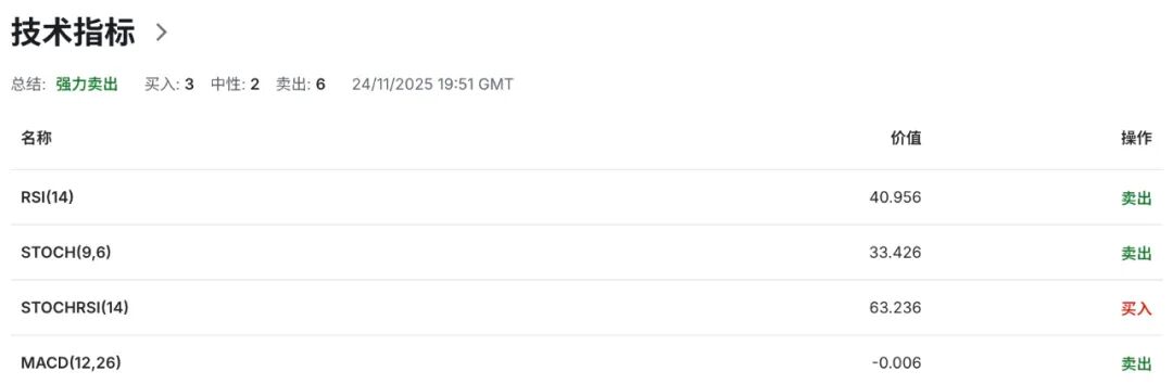 从日线技术指标来看,英镑兑美元周一继续运行于布林带中轨与下轨之间的弱势区域,且布林带整体开口持续收窄,反映市场波动率降低,暗示在英国预算案公布前,投资者情绪趋于谨慎,交投意愿有所减弱。在当前技术格局下,若后续布林带由收敛转为扩张,并伴随汇价进一步走弱,则可视为下行趋势动能得到加强的信号,英镑短期内或将面临更大的下行压力。目前布林带上轨已下移至1.3240附近,构成短期动态阻力;下轨则位于1.3020区域,提供对应动态支撑参考;中轨1.3130一线可视为判断多空力量转换的潜在分水岭。动能指标方面,14日相对强弱指标(RSI)当前读数为39,持续运行于50中性线下方,显示空头动能仍占据主导,市场整体动能偏弱,与技术形态所呈现的偏空格局相互印证。