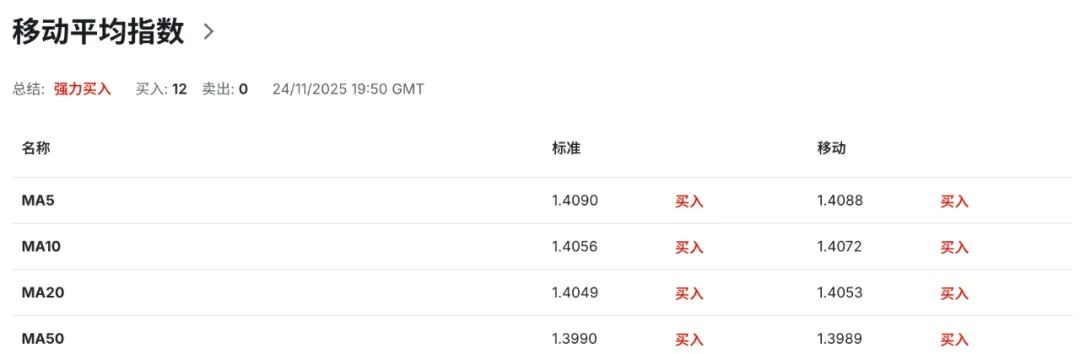 此外需要注意的是,1.4170区域水平为2025年2月以来下降趋势中斐波纳奇50%回撤位,技术上构成潜在强阻力。价格接近或触及该区域时,需警惕空头埋伏可能引发的快速回落,或因超买状态累积而出现的技术性回调风险。